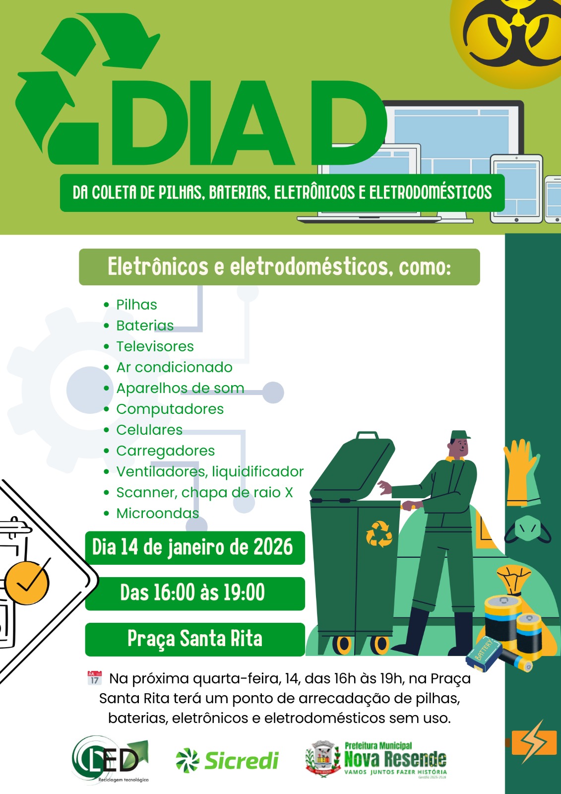 A Prefeitura de Nova Resende, em parceria com a LED Reciclagem Tecnológica e o Sicredi, promove na próxima quarta-feira o Dia D da Coleta de Eletrônicos e Eletrodomésticos.